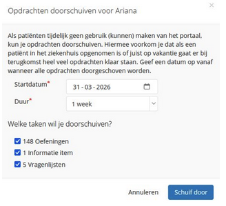 Het is nu mogelijk om opdrachten, zoals oefeningen, informatie en vragenlijsten, door te schuiven. Dit is handig wanneer een patiënt tijdelijk geen gebruik kan maken van het portaal, bijvoorbeeld bij een ziekenhuisopname of vakantie. Zo voorkom je dat er bij terugkomst een grote hoeveelheid opdrachten openstaat. Je kunt een datum instellen vanaf wanneer alle geplande opdrachten worden doorgeschoven. De knop hiervoor vind je bij ‘Opdrachten voor komende dagen’ op de detailpagina van de patiënt.