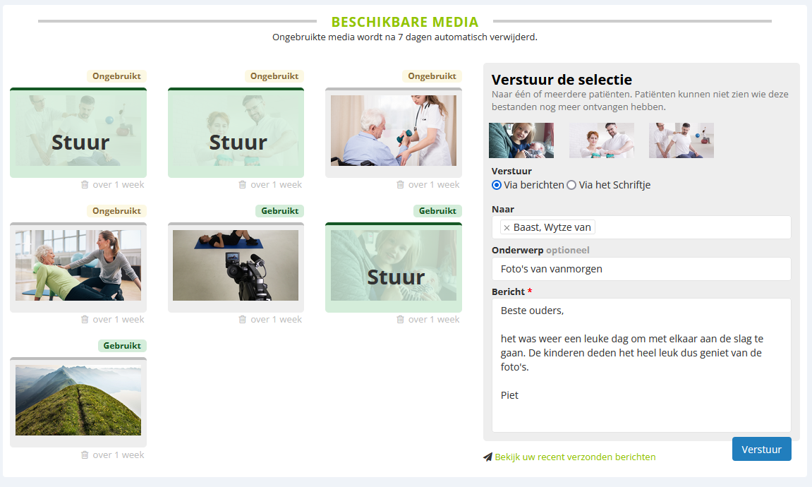 Via het portaal worden steeds meer foto’s en filmpjes gedeeld. Het moment van het maken van zo een foto en het versturen hiervan is vaak anders. Een groepsleider maakt bijvoorbeeld gedurende de dag een aantal foto’s en wil deze aan het einde van de dag naar de ouders van elk kind sturen. Dit kon tot nu toe niet handig. Een foto naar meerdere ouders tegelijk sturen kon niet en moest steeds één voor één gedaan worden. U moest daarbij dan de foto steeds opnieuw weer uploaden.
