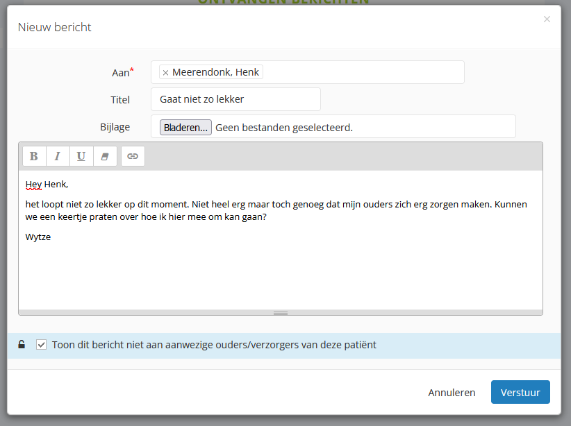 Hiervoor is het nu mogelijk om als kind een bericht te versturen waarbij u aangeeft dat dit niet getoond aan ouders moet worden. Ouders kunnen dit bericht dan helemaal niet zien. Ook als professional hebt u de gelegenheid zo een verborgen bericht te versturen.