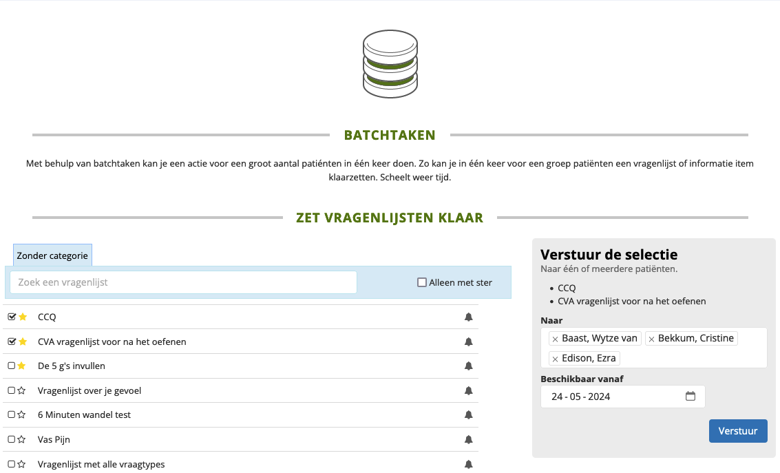 Via de Batchtaken kun je als behandelaar snel informatie of vragenlijsten klaarzetten voor een groep patiënten. In deze release is het zoeken en selecteren van die informatie en vragenlijsten verbeterd. Je kunt nu filteren op titel, categorie en of je er een ster aan hebt toegevoegd.