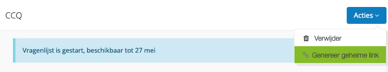 Soms kan het zijn dat een vragenlijst beantwoord moet worden door iemand anders dan de patiënt zelf. Dan moet bijvoorbeeld een docent of eerstelijns hulpverlener informatie aanleveren zonder dat die persoon zelf een account heeft. In deze situatie kun je als behandelaar via de knop `Acties` een `geheime link` aanmaken. Je ziet daarna een knop waarmee je de geheime link naar je klembord kopieert, zodat je die zelf naar de juiste persoon kunt sturen.