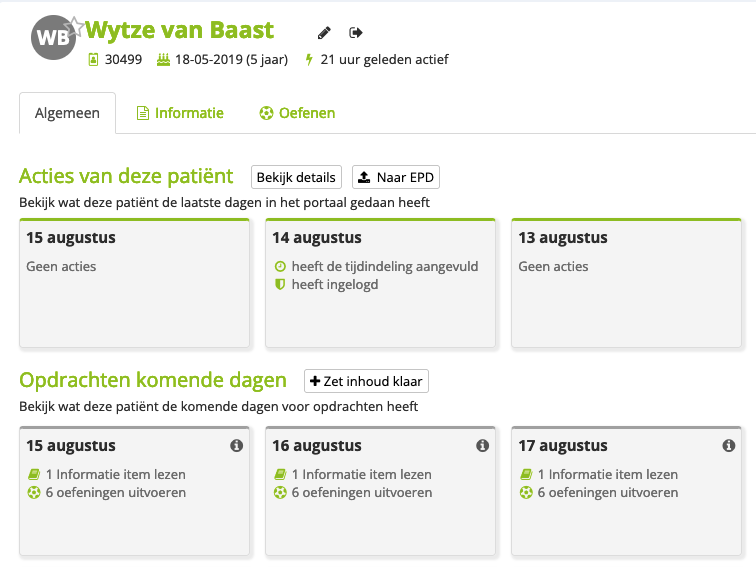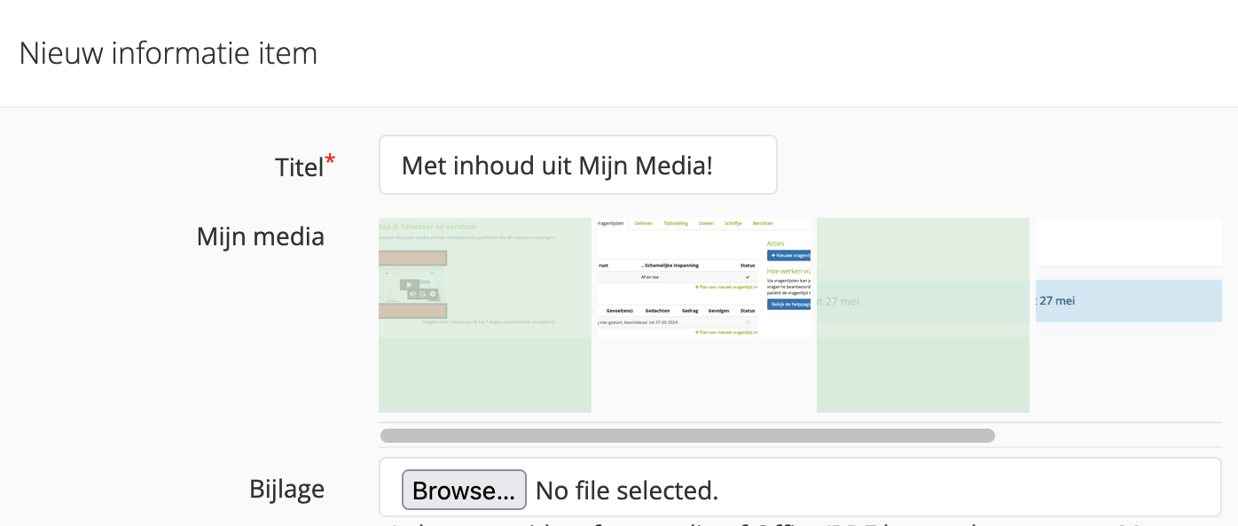 Via Mijn Media kun je foto's of video's toevoegen aan het portaal om op een later moment te gebruiken. Dat kon tot nu toe voor Berichten en het Schriftje. In deze release is het nu ook mogelijk om inhoud uit Mijn Media te gebruiken bij het toevoegen van een nieuwe persoonlijke oefening of informatie item! In plaats van een bijlage toevoegen kies je dan uit eerder toegevoegde media.