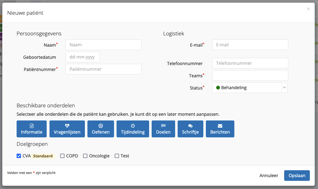 - Je ziet nu bij het aanmaken van een nieuwe patiënt duidelijk of de doelgroep verplicht is of niet
