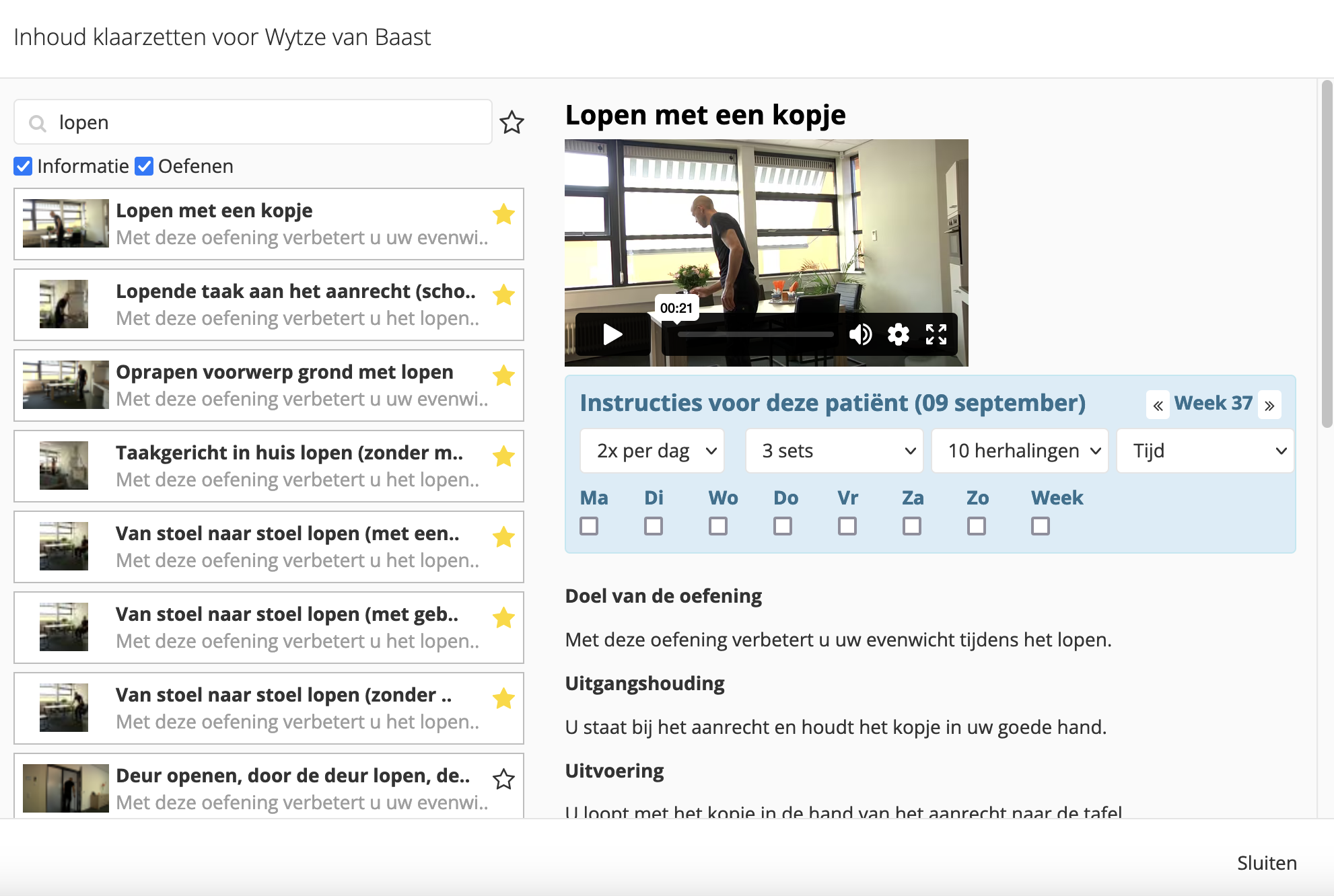 Je kunt deze zoekfunctie gebruiken door naar het detailscherm van een patiënt te gaan. Hier kun je naast Opdrachten komende dagen klikken op de knop 'Zet inhoud klaar'. Je ziet dan een dialoog met de nieuwe zoekfunctie.