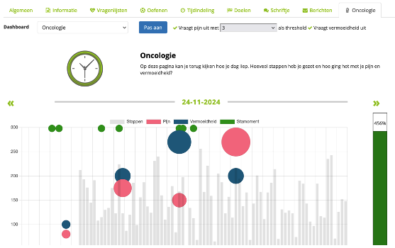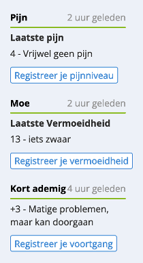 Bij sommige dashboards krijgt de patiënt de mogelijkheid een dagscore toe te voegen. Dit is een eenvoudige manier om een pijn-, vermoeidheid- of benauwdheid-score te registreren in het portaal. Deze dagscores worden dan, samen met de sensordata, getoond in het dashboard.