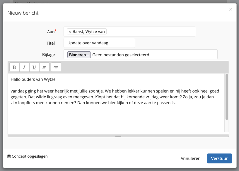 Bijlages worden op dit moment niet meegenomen in de conceptversie. De conceptversie is nu alleen beschikbaar bij berichten maar we overwegen dit ook te introduceren voor het schriftje.