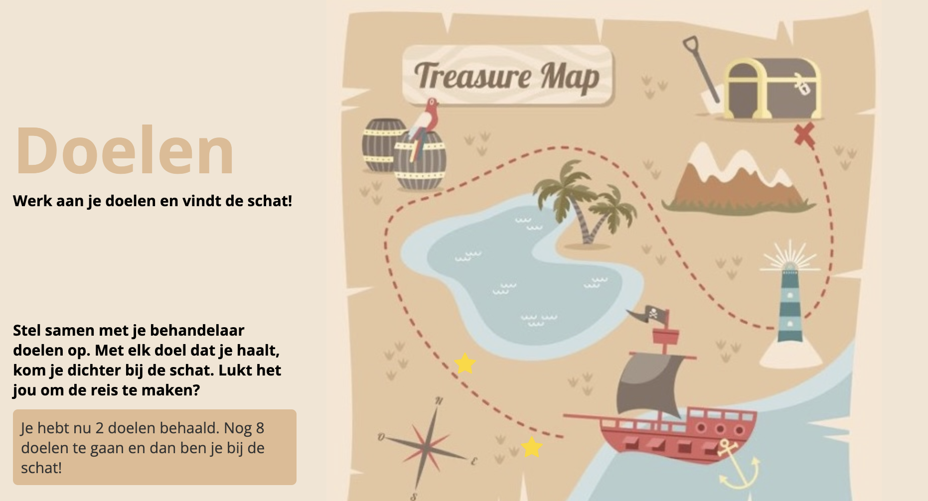 Als je als behandelaar instelt bij een kind dat de doelenpagina de 'Piraten weergave' moet hebben dan verschijnt er o.a. een schatkaart waarop je de voortgang kunt zien. Bij het behalen van een nieuw doel zie je confetti en een felicitatievideo. Het kind kan zelf geen doelen als behaald markeren maar kan wel thuis de confetti en de video nogmaals bekijken.